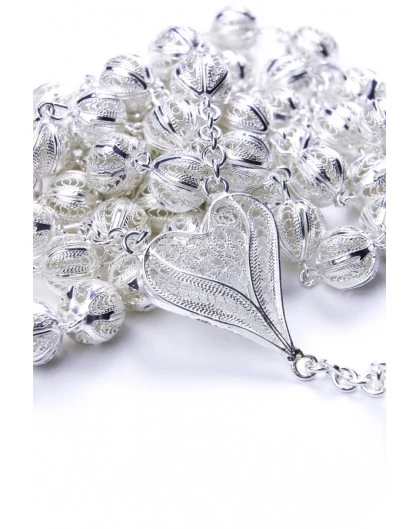 The Crucifix, the Heart shaped Center and the Beads are made with the Filigree tecnique, a rare jewellery hand work, made with tiny Sterling Silver wires, soldered together to compose delicate figures.