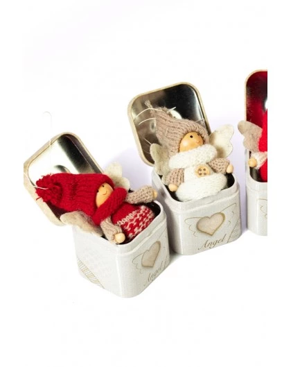 The 5 Angels in wood and wool are each kept in a small metal box. Can be used as a Christmas decoration thanks to the strap.