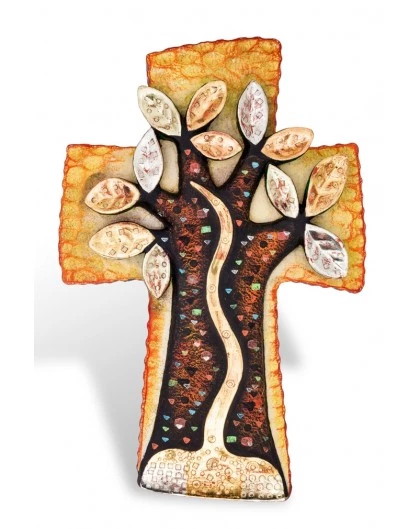 Tree of Life Cross, entirely made of fine wood carved and painted by hand in the northern part of Italy.Â